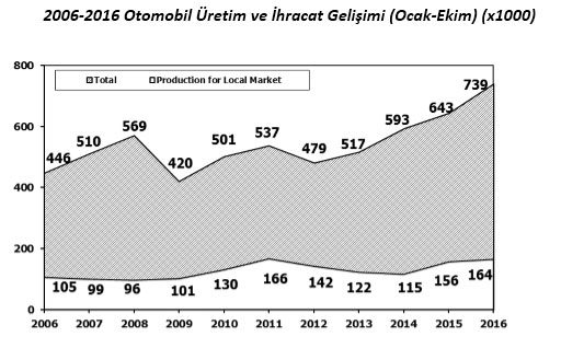 2016 yılı Ocak-Ekim döneminde bir önceki yılın aynı dönemine göre, toplam üretim yüzde 7, otomobil üretimi ise yüzde 15 oranında arttı. Bu dönemde, toplam üretim 1 milyon 179 bin adet, otomobil üretimi ise 739 bin adet düzeyinde gerçekleşti.