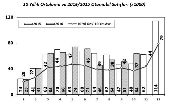 2016 yılı Ocak-Ekim döneminde bir önceki yılın aynı dönemine göre toplam pazar, yüzde 3 oranında azalarak 738 bin adet düzeyinde gerçekleşti. Bu dönemde otomobil pazarı yüzde 1 oranında arttı ve 553 bin adet olarak gerçekleşti.