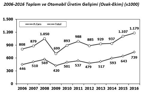 2016 yılı Ocak-Ekim döneminde bir önceki yılın aynı dönemine göre, toplam üretim yüzde 7, otomobil üretimi ise yüzde 15 oranında arttı.