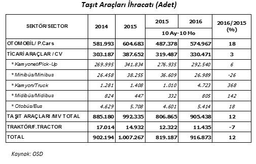 2016 yılı Ocak-Ekim döneminde bir önceki yılın aynı dönemine göre, toplam otomotiv ihracatı adet bazında yüzde 12 oranında artarken otomobil ihracatı ise yüzde 18 oranında artış gösterdi. Bu dönemde, toplam ihracat 905 bin adet, otomobil ihracatı ise 575 bin adet düzeyinde gerçekleşti.