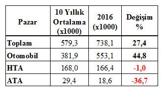 • Son 10 yıllık ortalamalara göre 2016 yılında toplam pazar yüzde 27 ve otomobil pazarı yüzde 45 oranlarında artarken hafif ticari araç pazarı yüzde 1, ağır ticari araç pazarı yüzde 37 oranında düşüş gösterdi.