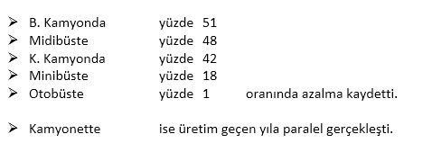• 2016 yılı Ocak-Ekim döneminde; geçen yılın aynı dönemine göre ağır ticari araç pazarı yüzde 43 oranında azalarak 18 bin 594 adet, kamyon pazarı yüzde 44 oranında azalarak 15 bin 997 adet, midibüs pazarı yüzde 43 oranında azalarak bin 501 adet ve otobüs pazarı yüzde 25 oranında azalarak bin 96 adet düzeyinde gerçekleşti.