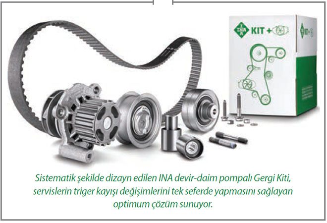 Tamirhanelerde bulunan devir – daim pompalı INA Gergi Kiti, conta ve vida gibi bağlantı parçaları da dahil olmak üzere onarım için gereken tüm parçaları içeriyor. Ayrıca gerekli olması durumunda doğru termostatı da tedarik ediyor. INA Gergi Kiti, parçaları tek tek birleştirilerek, gereken değişim için tüm işlemleri tek seferde çözümleme imkânı sunuyor. Hızlı bir şekilde uygulanan işlemler vakit ve maliyet tasarrufu sağlıyor. Çalışır durumdaki motorda bulunan bir ana tahrik sistemi söz konusu olduğunda triger kayışı ana bileşen durumuna geçiyor. Gergi makaraları ve kılavuz kasnakları yardımıyla kam milini en doğru biçimde hareket ettirecek hassas açıda tutan triger kayışı, giriş supaplarının en doğru zamanda açılıp kapanmasını sağlıyor.
