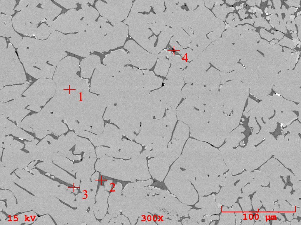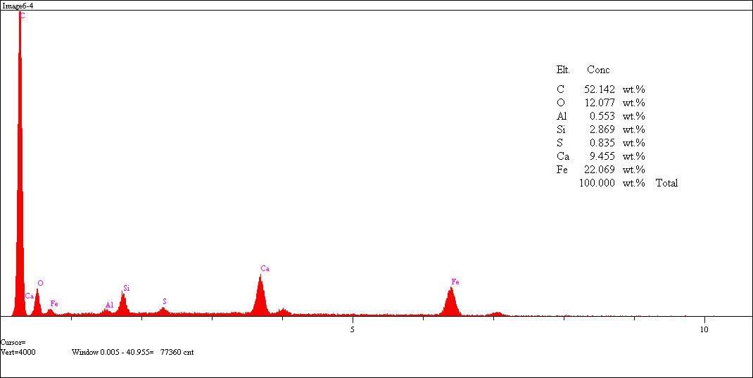 Daha yüksek büyütmeli SEM görüntüsünde curufun farklı bölgelerinde yapılan EDS analizleri Şekil 5’ de verilmiştir. Açık kontrastta ve ana matriksi gösteren 1. bölgeden alınan analiz spektrumu, yüksek demir ve oksijen içeriğiyle tipik bir demir oksit yapısının varolduğunu ve stokiometrisi göz önüne alındığında Wüstit (FeO) fazının baskın bir şekilde curufu oluşturduğu belirlenmiştir. Koyu konrastlı 2. bölgeden alınan analizde ise yapı silisyum ve kalsiyumca zengin olan bir oksit yapısını sergilemektedir. Silisyum çeliklerde bilindiği üzere bir taraftan katı ergiyik sertleştirici olarak görev alırken, diğer taraftanda özellikle döküm koşullarında iyi bir deoksidant olup curuf yapıcı element olarak da katkı sağlar. Kalsiyum katkısı ile gerçekleştirilen kalsiyum işlemleme ise özellikle yüksek kalite çeliklerin üretiminde gerekli olan ve çeliğin minimum seviyede empürite içermesine aktif katkı sağlayan bir proseslemedir. Matriks içerisinde 3. bölgenin ise ilgili elementel dağılımınında bir göstergesi olarak bakırca zengin tipik bakır oksit yapısı olduğu görülmektedir. 4. bölge reaksiyona kısmen girmeyerek sistemde çeşitli empürite atomları ile birlikte bulunabilen oldukça ince bir kömür taneciğini göstermektedir.