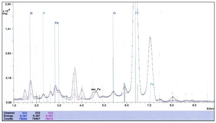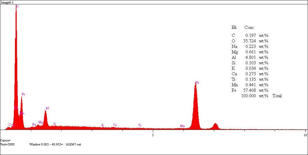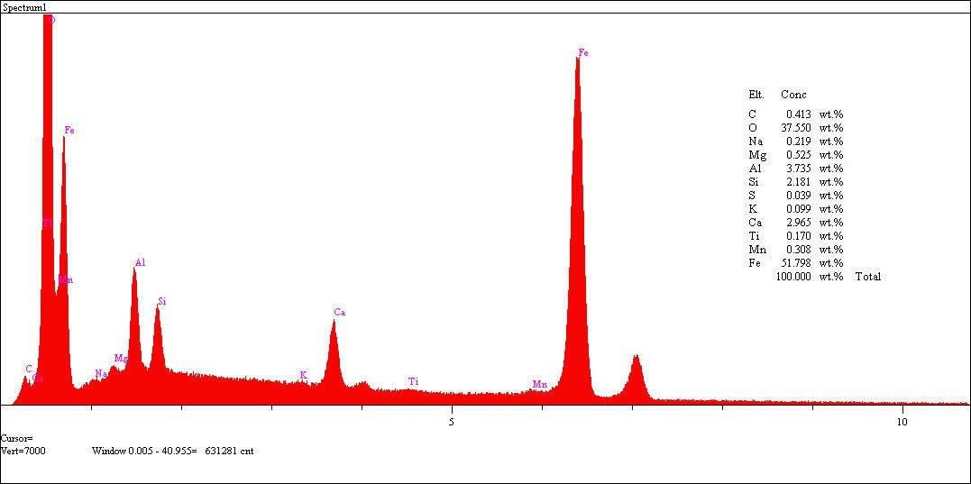 Hadde tufali üzerine özellikle demirin tayini için ise X-ışınları floresans (XRF) analizi yapılmıştır. Şekil 2’de bu analize ait spektrum ve Tablo 3’de spektrum üzerinden alınan elementel dağılım yüzdesel olarak verilmiştir. Yüzdesel elementel dağılım göz önüne alınacak olunursa, demir ve oksijen içeriğinin oldukça yüksek olduğu ve özellikle Mn, Si ve Cr gibi kompleks oksit oluşuturucu elementlerin de tufal içerisinde var olduğu belirlenmiştir.