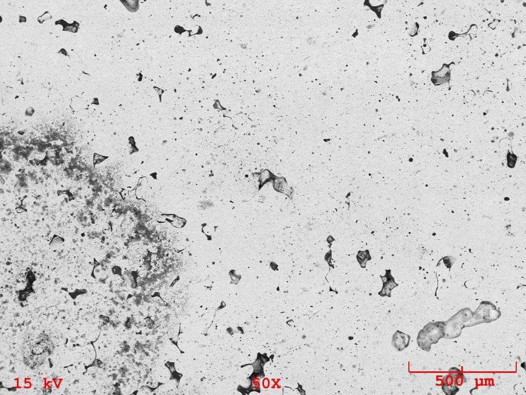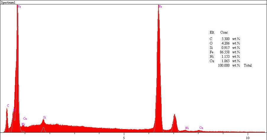 Redüksiyon proseslerinde -metalizasyon oldukça önemli bir kavramdır. Deneysel çalışmada elde edilen sünger demir içeriğindeki metalik demir sistemin verimini ve hammaddenin indirgenebilirliğinin bir göstergesidir. Elde edilen sünger demirin ergitilip, curufun ayrılmasıyla elde edilen metalik ürünün tarama elektron mikroskop (SEM) görüntüsü ve elementel dağılıma ilişkin enerji dispersif spektrometre (EDS) ile belirlenen spektrum Şekil 3a ve b’de verilmişir. SEM görüntüsündeki siyah bölgeler kömürden gelen karbonca zengin bölgeleri göstermekte olup alansal EDS spektrumu karbon oranını 5 olarak göstermektedir. Başlangıç XRF analizinde demir miktarı 69.1 olarak tayin edilmiştir. Ancak indirgenen hadde tufalinin reaksiyon ürünü olan sünger demirin ergitme sonrası katılaştırılmış formu 86.5 miktarında demir içermektedir. Bu ise prosesleme koşullarında redükleme koşullarının iyi bir seviyede olduğunu ve metalizasyon derecesinin yüksek olduğunu işaret etmektedir.