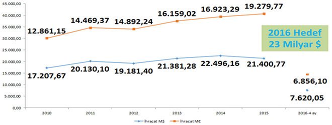 TAYSAD Başkanı Alper Kanca, ihracat rakamlarındaki gelişmeyi değerlendirirken, 2015 yılı euro bazındaki birim fiyatının, 2010 yılına oranla yüzde 12,5 dolayında artış gösterdiğini ve 4,82 Euro’ya kadar yükseldiğini ifade etti. Yılın ilk 4 ayında da bu rakamın 4,83 euro/ kg olarak gerçekleştiğini dile getiren Başkan Kanca, 2016 Nisan sonu itibariyle TÜİK verileri dikkate alındığında tedarik sanayi ihracatının dolar bazında 3 milyar’ı; euro bazında ise 2,7 milyar’ı aştığını belirtti. Toplam sektör ihracatı ise yine bu dönemde dolar bazında 7,6 milyar iken, Euro bazında 6,6 milyar seviyesinde gerçekleşti. TAYSAD Başkanı Alper Kanca, “Yılın diğer yarısının beklenildiği gibi devam etmesi halinde 2016 yılı sonunda toplam sektör ihracatımızın 23 milyar doları geçmesini bekliyoruz. Tedarik sanayimiz ise bu rakamın yaklaşık 9,3 milyar dolarlık kısmını gerçekleştirecektir” şeklinde konuştu.