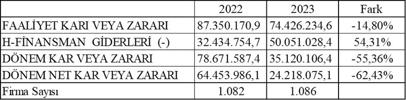 2022 yılında faaliyet kârı 87.350.710,9 TL iken 2023 yılında bu rakam 74.426.434,6 TL’ye düşmüştür. Ayrıca, dönem kârı 2022 yılında 78.671.857,4 TL iken 2023 yılında 35.120.106,4 TL’ye düşmüştür.