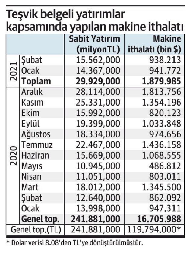 İthal makine ve teçhizatın, sabit yatırım içindeki payı 2021 yılının ilk iki ayında ise yüzde 50’nin üzerine çıktı. Bu kapsamda şubat sonu itibarıyla toplam 29 milyar 929 milyon liralık sabit yatırım öngörüldü. Bu yatırımlar için 1 milyar 879 milyon dolarlık makine ithalatı yapılacak. İthal makinenin TL cinsinden karşılığı 15 milyar 190 milyon lira ve sabit yatırıma oranı ise yüzde 50.75 seviyesinde.