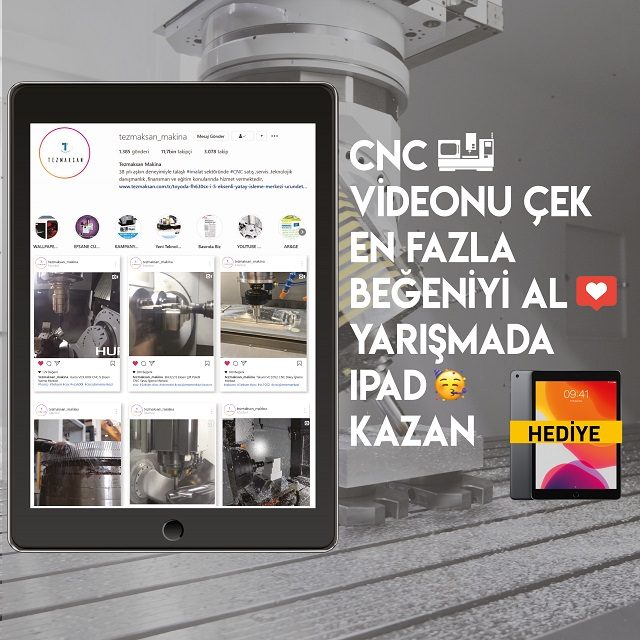 Tezmaksan markalarından herhangi bir CNC tezgah ile talaşlı imalat videonu çek, kendi instagram profilinde bizi @tezmaksan_makina etiketleyerek paylaş, Tezmaksan takipçilerinden en fazla beğeniyi al Ipad kazan. Yarışma katılım koşulları 👉 www.tezmaksan.com.tr