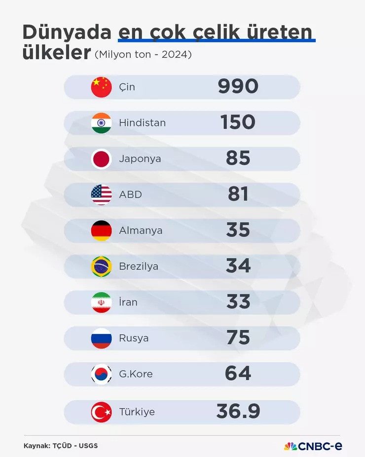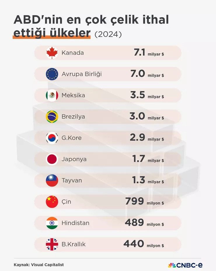 CNBC'den Zafer Karataş'ın haberine göre Dünya Çelik Birliği (Worldsteel) verilerine göre, ABD'nin çelik üretimi 2024'te yıllık yüzde 2,4 azalışla 79,5 milyon ton oldu. Ülkenin çelik ithalatı son 10 yılda belirgin bir şekilde düşüş gösterdi. ABD'nin çelik ithalatı 2014 ile 2024 yılları arasında yaklaşık yüzde 35 azaldı. ABD'nin en fazla çelik ithal ettiği diğer ülkeler Meksika, Brezilya, Güney Kore, Almanya, Japonya, Tayvan, Vietnam, İtalya ve Çin oldu.