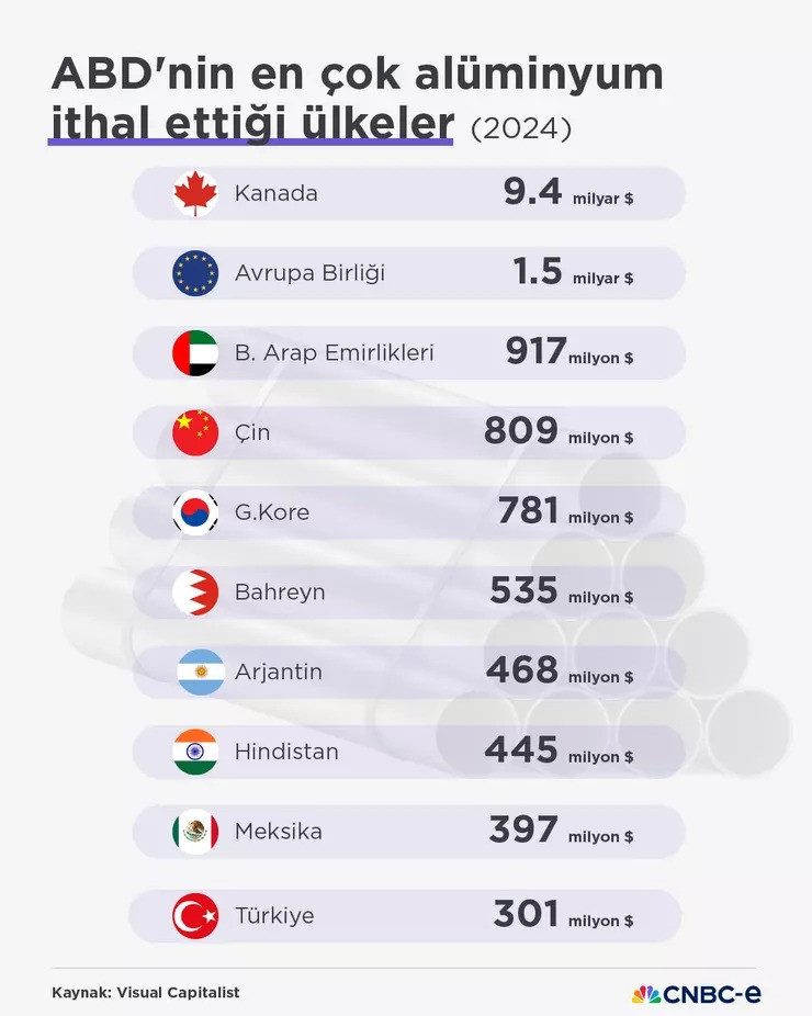 TÜİK'in verilerine göre, 2024 yılında Türkiye, ABD'ye toplam 300 milyon doları aşan alüminyum ve alüminyumdan eşya ürünü gönderdi. Bu verilere bakıldığında, ABD'nin en çok alüminyum ithal ettiği 10. ülke Türkiye oldu. Bu alanda Türkiye'nin hemen önünde 397 milyon dolar ile Meksika yer alıyor.
