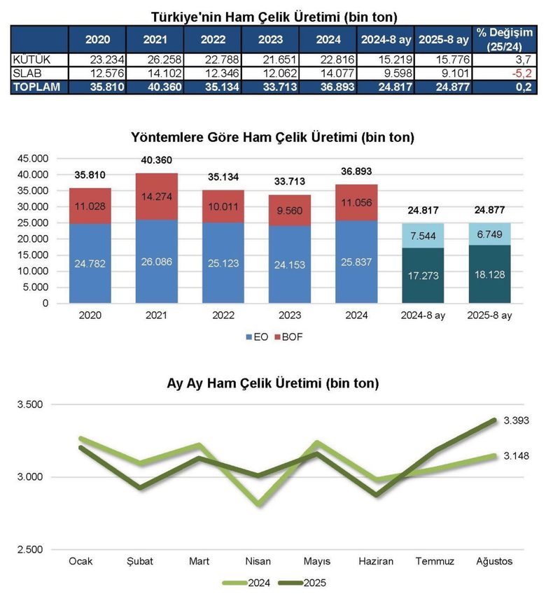 Bu veriler ışığında, 8 aylık dönemde ham çelik üretimi, geçen yılın aynı dönemine kıyasla %0,2 artışla 24,9 milyon ton oldu. Kütük üretimi %3,7 artarken, slab üretimi %5,2 azalış kaydetti.