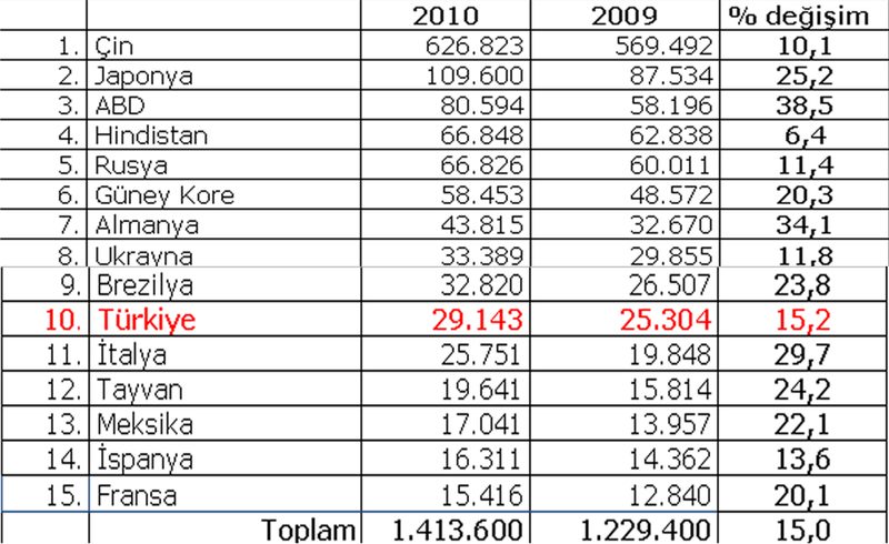 Aralık ayında 8.8 oranında üretim artışı elde eden Çin Halk Cumhuriyeti, Ocak-Aralık döneminde, 10.1 oranında artışla, üretimini 569 milyon tondan 627 milyon tona yükseltirken, en fazla ham çelik üreten 10 ülke içerisinde, üretimini en fazla arttıran ülkeler, ABD ( 38.5), Almanya ( 34.1), Japonya ( 25.2) ve Brezilya ( 23.8) oldu. 2010 yılında en büyük 10 çelik üreticisi arasında üretimi en düşük oranda artan ülke ise, 6.4 oranındaki üretim artışı ile Hindistan oldu.