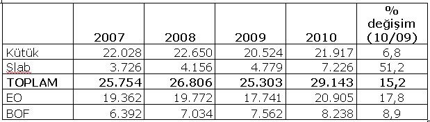 2010 yılında, ham çelik üretimini, 2009 yılındaki 25.3 milyon ton seviyesinden 15.2 oranında artışla, 29.1 milyon tona yükselten Türkiye’nin yassı ürünlere yönelik ham çelik üretimi, yeni kapasitelerin üretimlerini arttırmalarının da katkısıyla, 51.2 oranında artışla, 4.78 milyon tondan 7.23 milyon tona ulaştı. Türkiye’nin uzun ürünlere yönelik ham çelik üretimindeki artış ise, 6.8 seviyesinde gerçekleşti ve üretim 20.52 milyon tondan, 21.92 milyon tona çıktı.